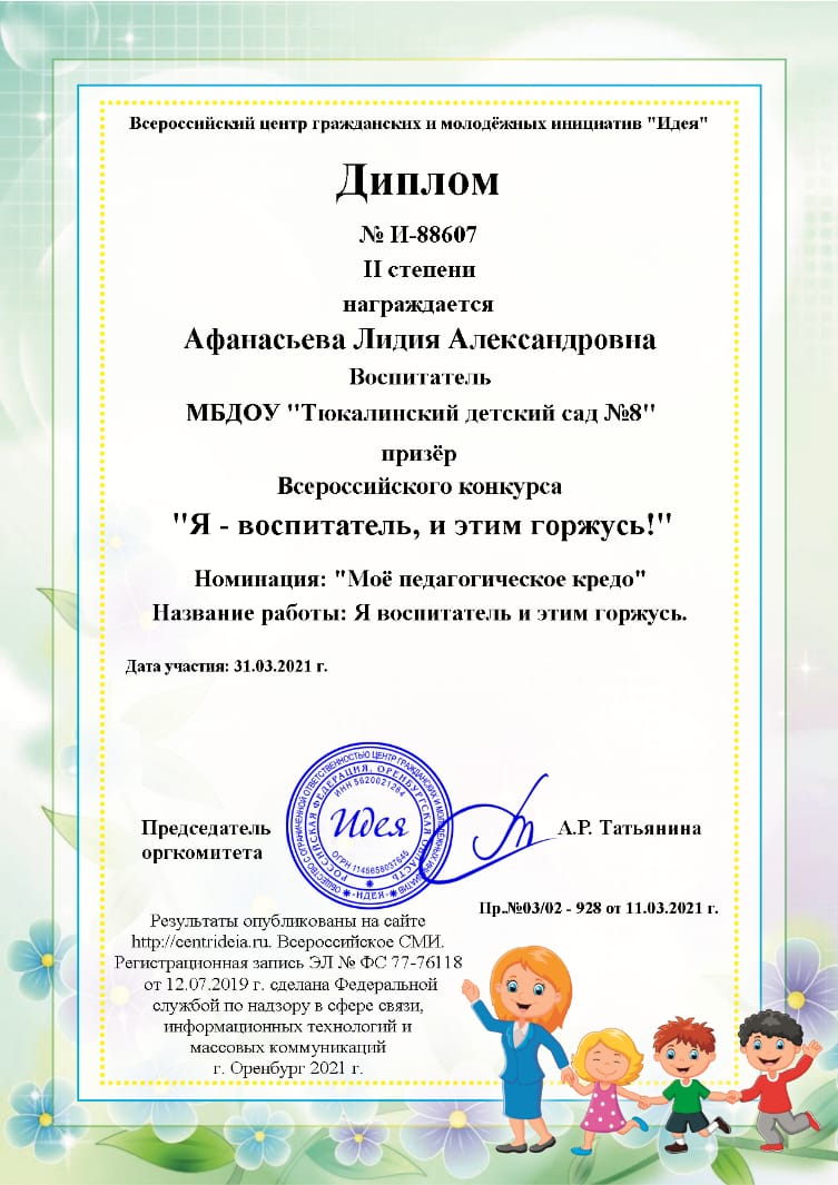 Развитие творческой инициативы, повышение профессионального мастерства работников системы дошкольного образования. В конкурсе «Я- воспитатель, и этим горжусь!» приняла участие воспитатель высшей категории Афанасьева Лидия Александровна в номинации «Мое педагогическое кредо» с названием работы «Я воспитатель и этим горжусь», где стала призером и была награждена дипломом второй степени.