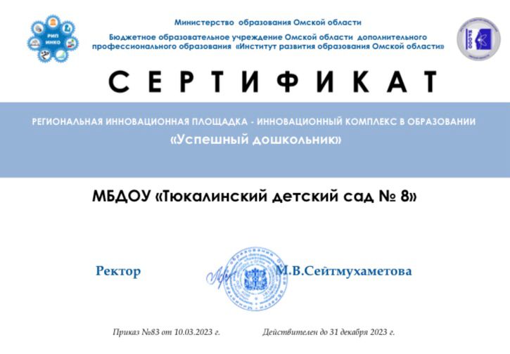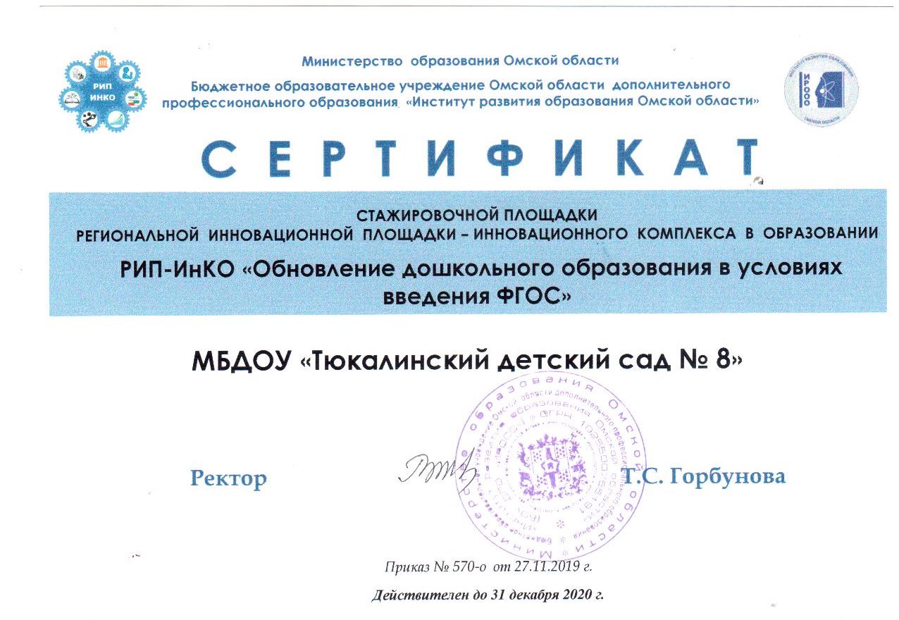 МБДОУ «Тюкалинский д/с №8» является стажировочной площадкой РИП-ИнКО «Обновление дошкольного образования в условиях введения ФГОС». На базе нашего детского сада работает творческая группа педагогов. В 2019 году работаем по программе брендирования «Детский сад — Качество — Успех».