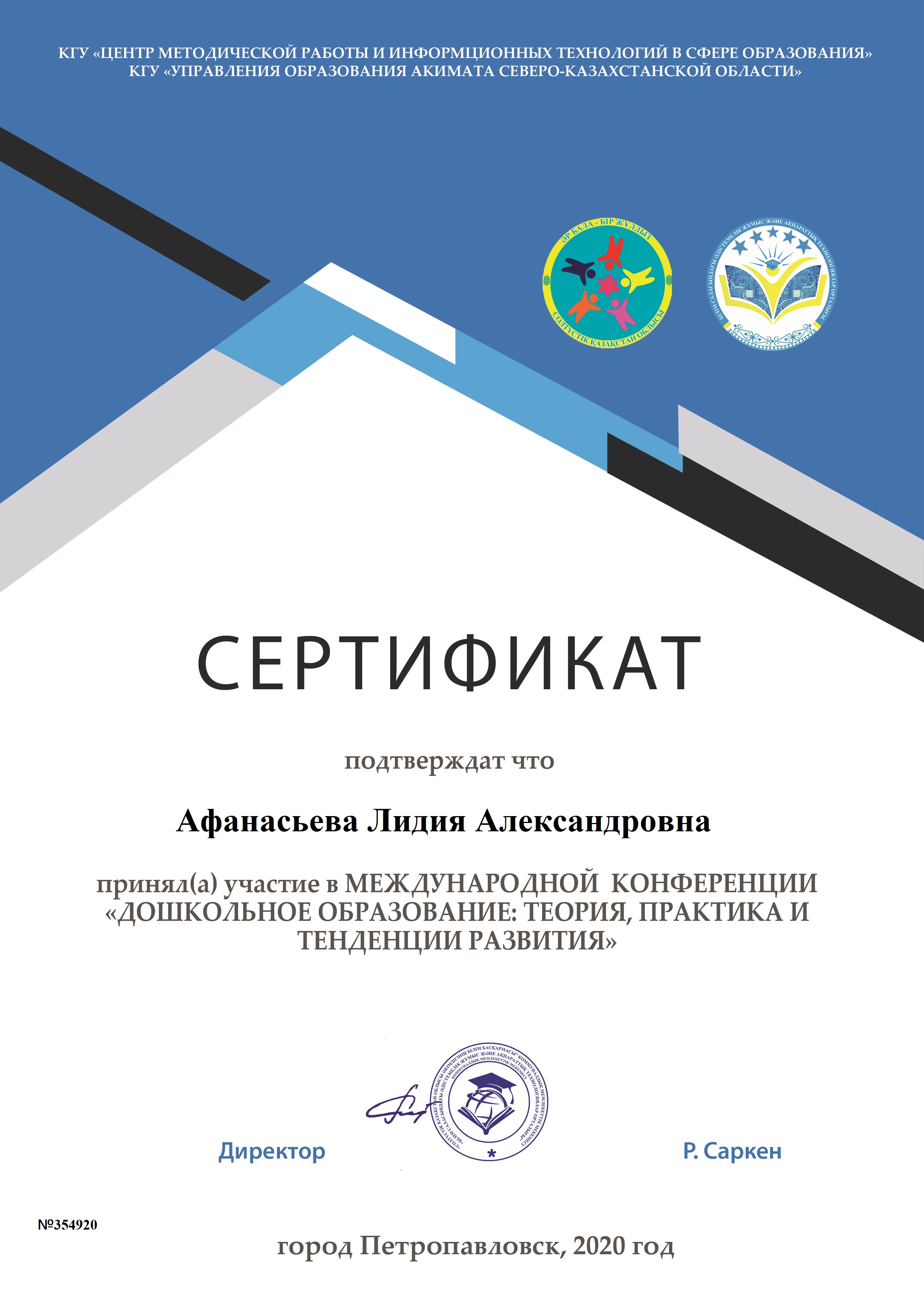 Афанасьева Лидия Александровна воспитатель МБДОУ «Тюкалинский д\с №8», приняла заочное участие в Международной конференции с участием педагогов РФ в рамках сотрудничества «Дошкольное образование: теория, практика и тенденции развития». Организатор конференции – КГУ «Центр методической работы и информационных технологий в сфере образования» КГУ «Управление образования акимата Северо – Казахстанской области» г. Петропавловска. Лидия Александровна представила опыт работы по теме «ОРГАНИЗАЦИЯ ВЗАИМОДЕЙСТВИЯ ВОСПИТАТЕЛЯ