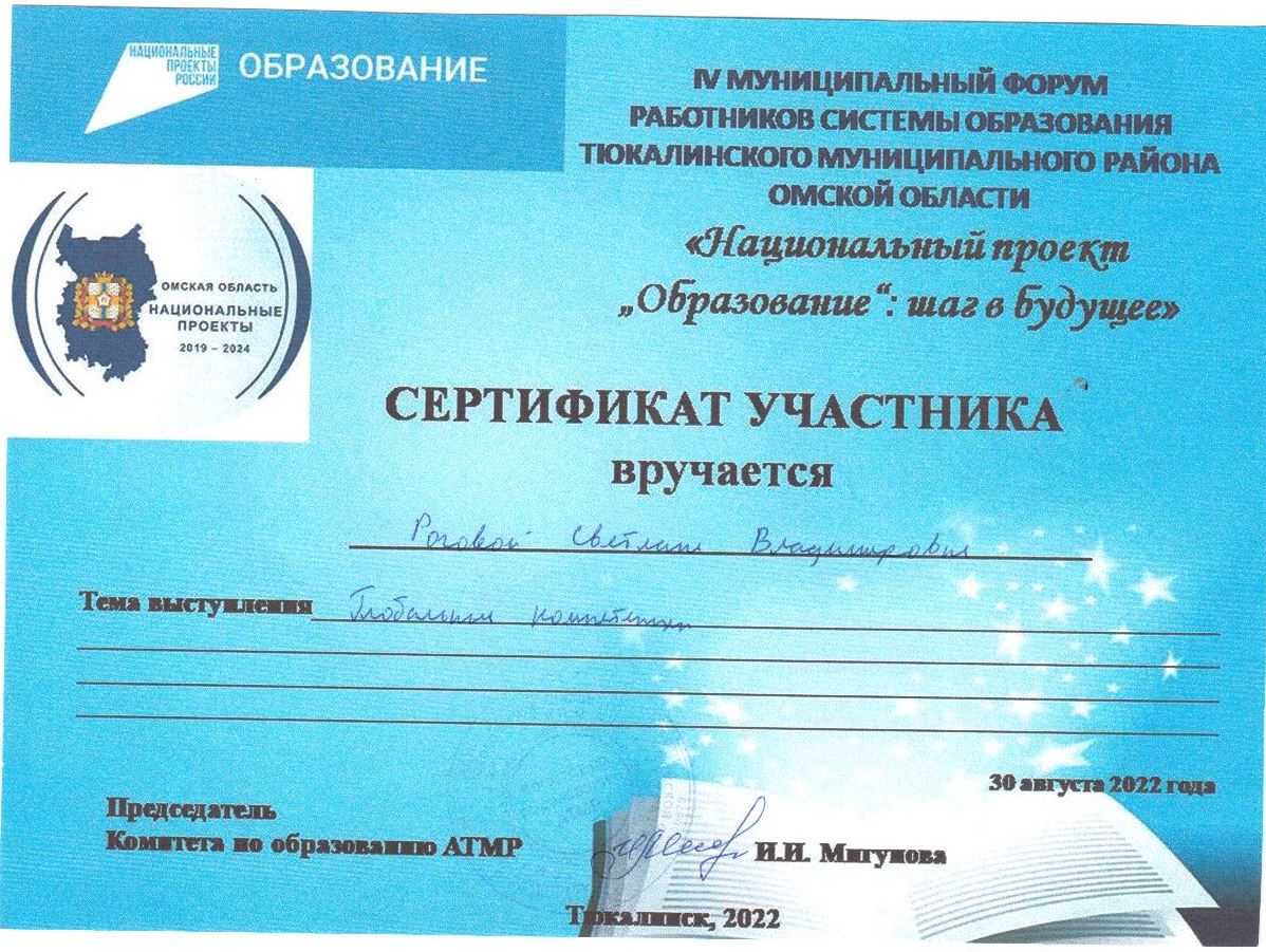 30 августа 2022 года состоялось августовское совещание работников системы образования Тюкалинского муниципального района в рамках Областного августовского форума «Национальный проект «Образование»: шаг в будущее. Работа проводилась на диалоговой площадке «Трансформация образовательной среды дошкольной образовательной организации в современных условиях». С докладом «Глобальные компетенции выступила старший воспитатель Рогова С.В.