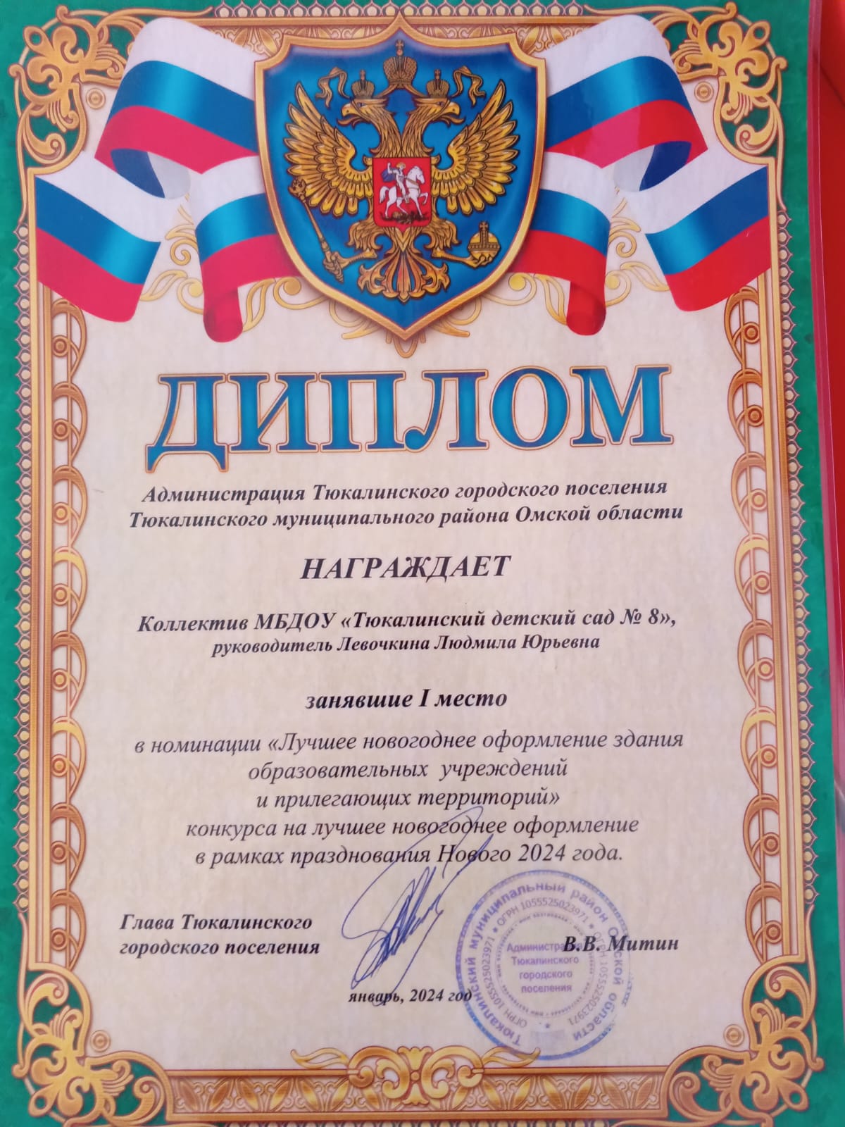 Зима для детей долгожданная и любимая пора, удивительное время года, когда вся природа одевается в белый, пушистый наряд и у ребят появляется прекрасная возможность мастерить разнообразные постройки из снега. Ребята знают, как только наступает зима, участки детского сада превращаются в сказочную и волшебную страну, которую населяют герои любимых сказок, вылепленные из снега. Снежные фигуры украшают участок детского сада, вызывая у ребят положительный эмоциональный настрой, желание идти на прогулку, чтобы навестить своих сказочных героев. Создание снежных построек стало традиционным в Муниципальном бюджетном дошкольном образовательном учреждении «Тюкалинский детский сад № 8». Вот уже не первый год сотрудники детского сада строят целый снежный городок. Яркие, интересные снежные фигуры гордо украшают территорию учреждения. Вот и этой зимой вырос на участке сказочный городок. Используя удивительный материал - снег, педагоги погрузились в процесс сооружения сказочных снежных фигур. Территория учреждения стала похожа на снежное царство. Сколько радости и восторга можно увидеть в детских глазах, когда в снежных фигурах они узнают своих любимых сказочных персонажей. Ребята с удовольствием обыгрывают снежные постройки, которые не только вносят разнообразие в детские игры, но и развивают художественный вкус и стимулируют двигательную активность детей. Не только дети и родители, но и каждый прохожий с восхищением и радостью разглядывает снежную сказку нашего учреждения. Каждый год наше учреждение участвует в конкурсе «Лучшее новогоднее оформление здания образовательных учреждений и прилегающих территорий». 13 января состоялось награждение. Заместитель главы Тюкалинского городского поселения Сергей Евгеньевич Хоперский поздравил всех и наградил победителей конкурса «Лучшее Новогоднее оформление» Дипломами Администрации Тюкалинского городского поселения и денежными сертификатами. В Номинации «Лучшее новогоднее оформление здания образовательных учреждений и прилегающих территорий» наш детский сад занял 1 место. Поздравляем коллектив с хорошей и успешной работой.