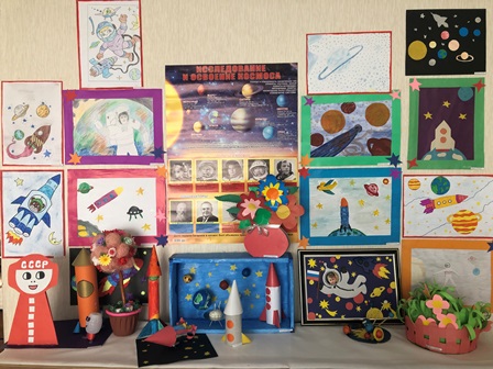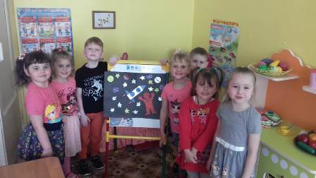 С детьми была проведена беседа на тему "Космические дали". Детьми был построен " Космический корабль" из строительного материала. Воспитатели побеседовали с детьми о первом космонавте в мире, Юрии Алексеевиче Гагарине. Изучили с детьми стихотворение "Юрий Гагарин" автор В. Степанов. Провели сюжетно-ролевую игру"Космическое путешествие к звездам". Познакомили детей с профессией космонавта. Также воспитанники средней группы изготовили рисунки ракет, и приняли участие в создание коллективной аппликации "Космические дали". В приемнике оформлена выставка на тему "Космос" в которой приняли участия дети совместно с родителями. Было прочитано много рассказов о космических путешествиях и загаданы загадки.