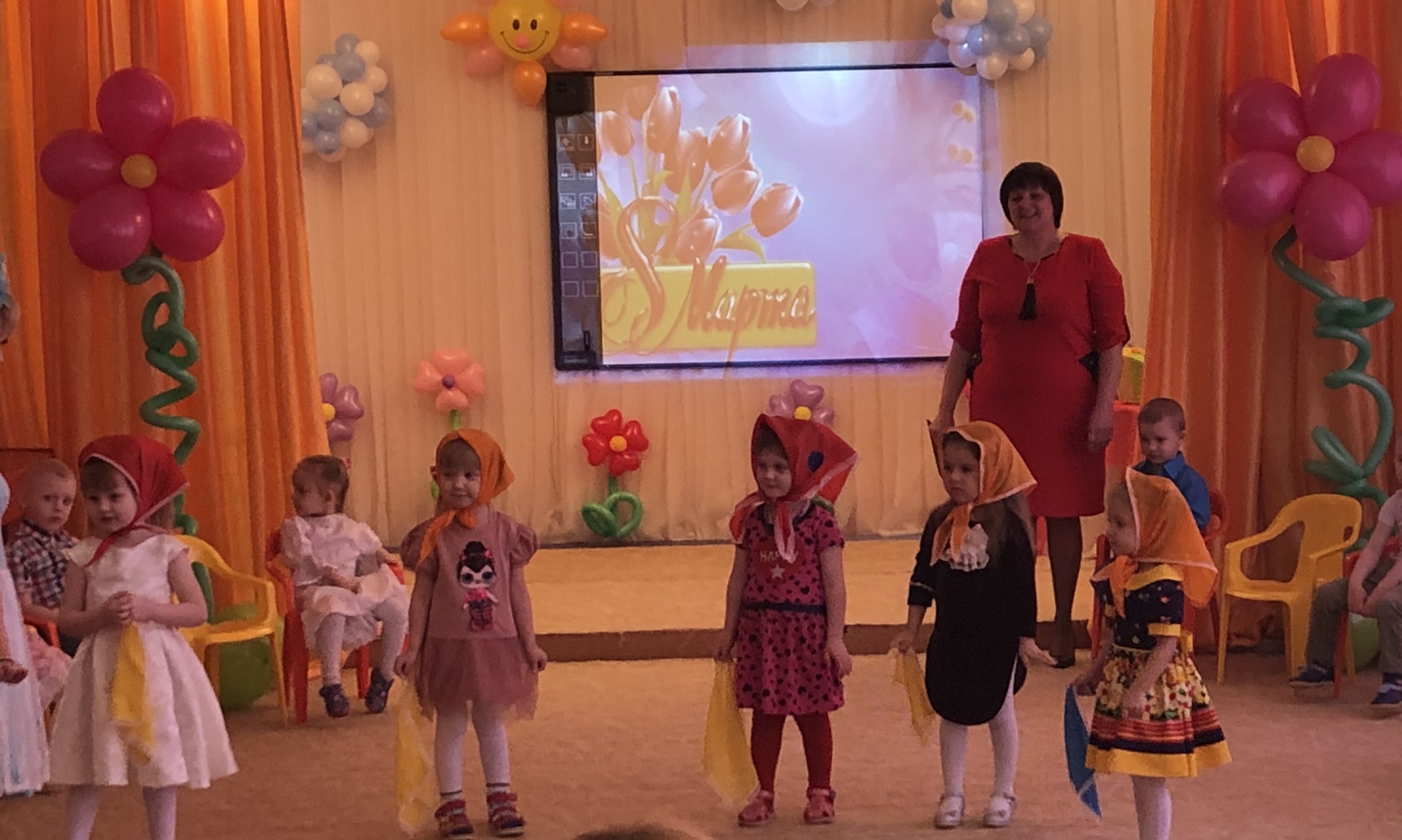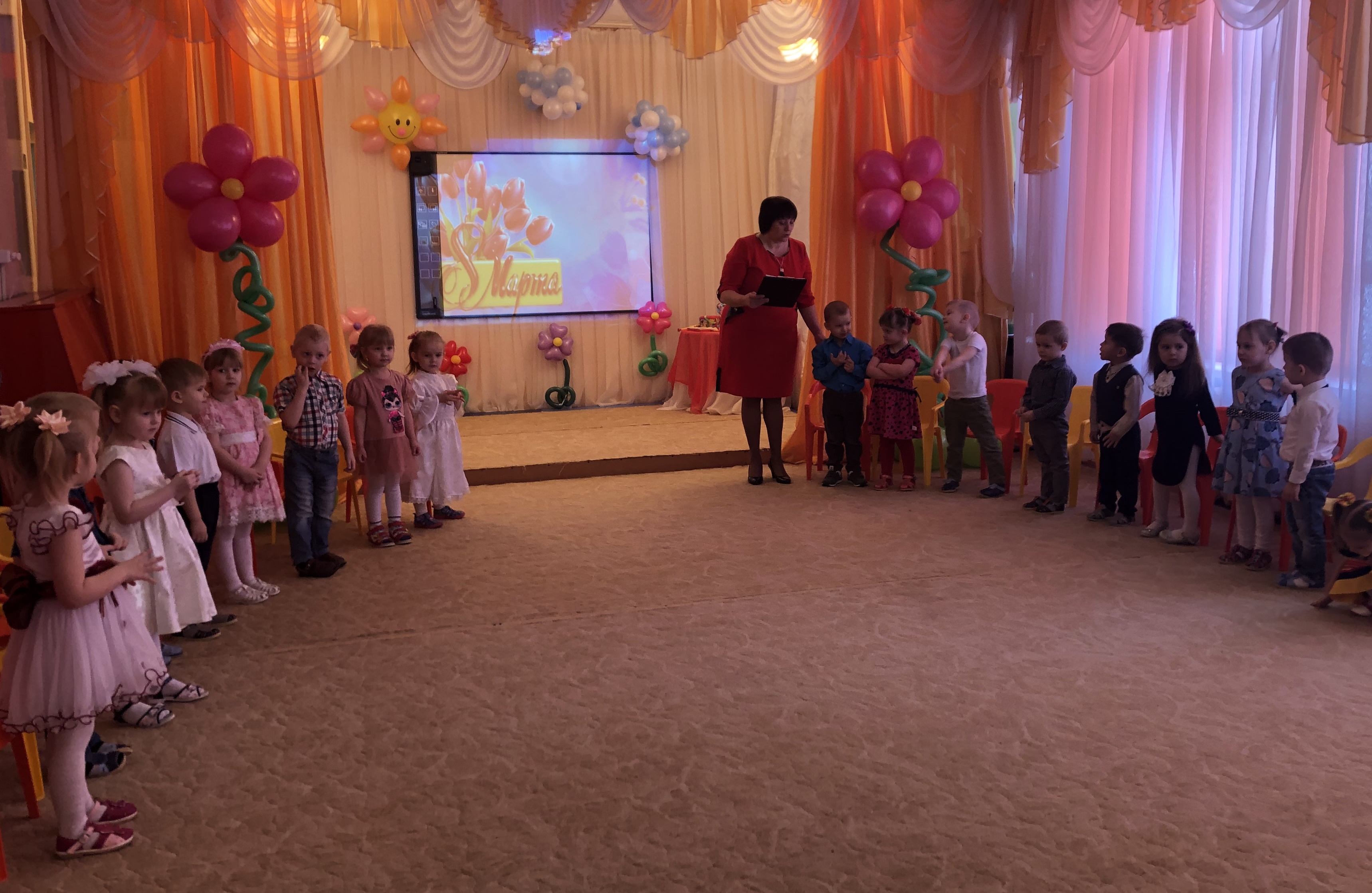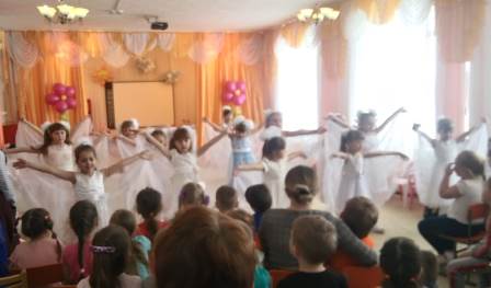 Зал был празднично украшен. Девочки и мальчики поздравляли своих мам и бабушек, рассказывали им праздничные стихи, пели песни, танцевали, играли в веселые игры. Мамочки также были активными участниками праздника.