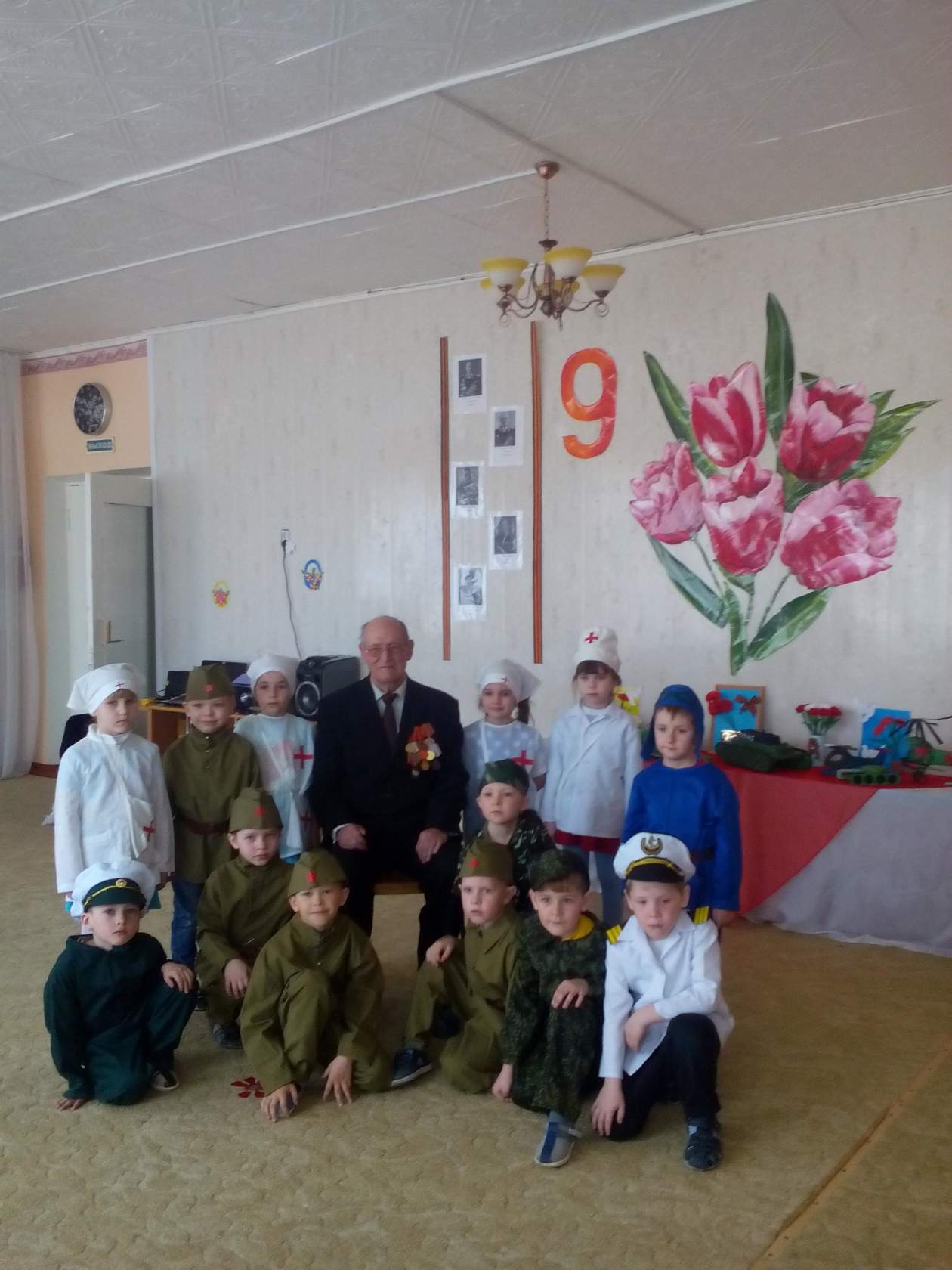 День Победы в Великой Отечественной войне – это праздник, который греет сердце каждого россиянина. Для молодого поколения эти майские дни – героические страницы истории нашей Родины. Несмотря на то, что прошло столько лет со дня окончания войны, память о ней жива в сердцах ветеранов, тружеников тыла, детей, внуков, правнуков. 2 мая в преддверии празднования Дня Победы в гости к детям старшей и подготовительной групп пришел труженик тыла Сергей Андреевич Юров. Дети читали стихи, пели песни. С неподдельным интересом ребята слушали рассказ Сергея Андреевича о тяготах военного детства. Дети расспрашивали его о наградах, которые закрывали всю грудь ветерана.   Каждый из ребят хотел дотронуться рукой до наград.  Дети поблагодарили ветерана за интересный рассказ. Всё дальше и дальше уходят от нас события Великой Отечественной войны, и такие встречи необходимы ребятам для воспитания нравственно- патриотических чувств: любви к Родине, к её Защитникам, уважения к старшим, забота о ветеранах, ведь их осталось очень мало. Напоследок сделали совместное фото, которое будет опубликовано на первой странице районной газеты "Тюкалинский вестник". Хочется поздравить всех с этим светлым, радостным, торжественным праздником, пожелать мирного неба, неиссякаемого здоровья и отдать дань памяти всем кто защищал нашу Родину. С Днём Великой Победы!