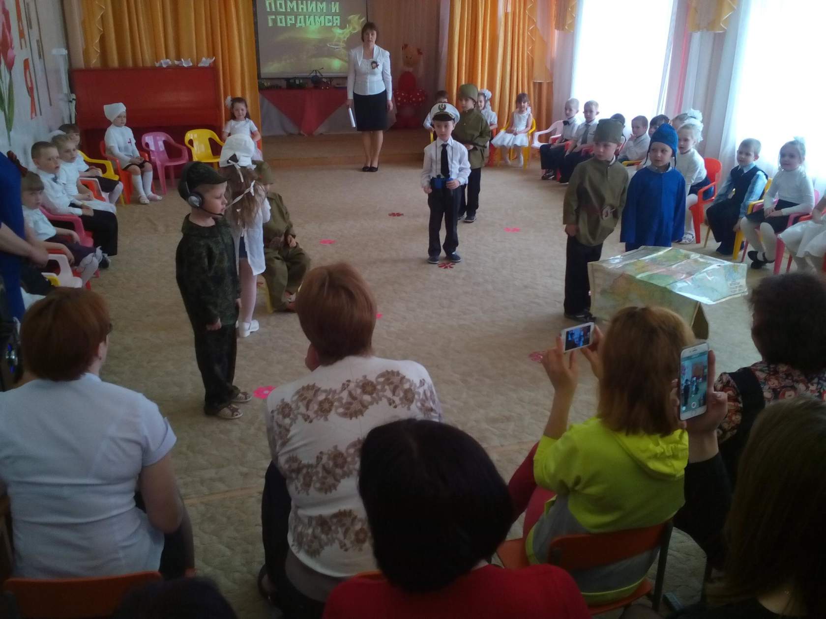 На протяжении десятилетий 9 мая остается в России самым трогательным, самым душевным праздником и славной датой. Никакие другие праздники не смогут сравниться с ним.  День Победы — святой для каждого из нас праздник и мы, сегодняшние граждане страны, обязаны передать память о Победе, сами традиции празднования Дня Победы будущим поколениям. В нашем детском саду тоже состоялось мероприятие, посвященное празднованию Дня Победы. Предварительно с детьми в группах были проведены занятия, беседы о подвигах советских людей, в группах были оформлены выставки детских работ, оформлены родительские уголки,   а праздник стал итогом этих мероприятий. Дети показали танец «Синий платочек», упражнение с флажками и цветами «День Победы», пели песни «В День Победы», «День Победы», «Победный марш», «Пусть всегда будет солнце». А также соревновались в эстафетах «Санитарки», «Марш-бросок». Дети вспомнили пословицы о силе, отваге, о солдатах. Дети вместе с педагогами и родителями исполнили песню военных лет «Катюша». По окончании праздника, воспитанники вместе с педагогами возложили цветы к памятнику павшим воинам в Великой Отечественной войне, пообщались с ветеранами и сфотографировались с ними на память.