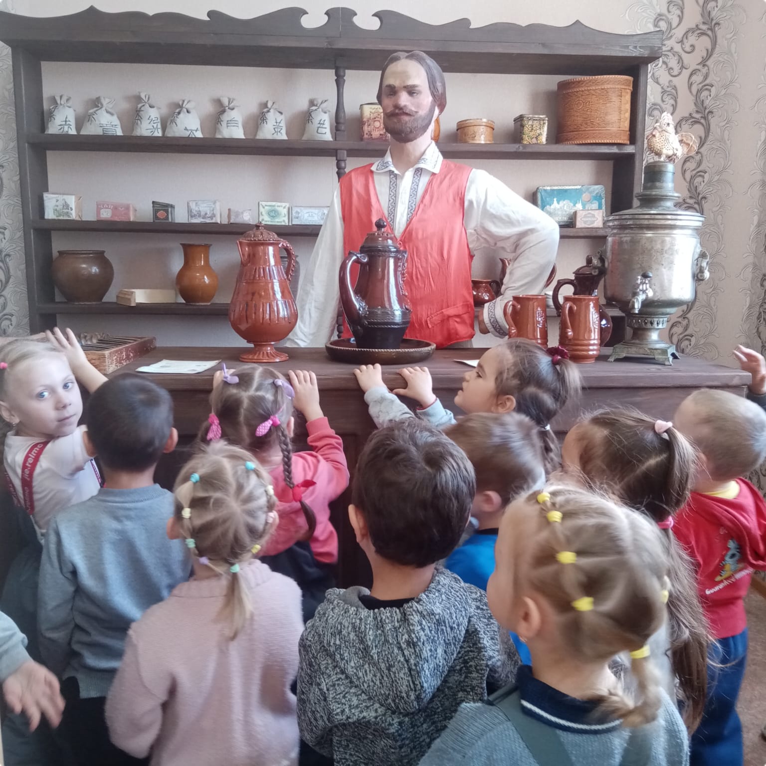19 Октября 2023 года воспитанники старшей группы «Пчелки» вместе с воспитателями посетили историко-краеведческий музей Чайную комнату. На пороге нас встретила экскурсовод Ирина Викторовна. В музее хранится то, что было задолго до нашего появления, то, что осталось от былых времен и в наше время имеет большую историческую и культурную ценность. Поэтому перед экскурсией в музей возникает ощущение предстоящей встречи с чем-то необычным и особенным. Вот и сегодня мы с ребятами посетили Чайную комнату. Познакомились с чаем, Иван чаем. Рассматривали чайные сервизы, как в старые времена пили из блюдец. Посмотрели, как правильно разжигать угли, чтобы попить горячего чая из самовара. Так же посмотрели, какой был раньше комковой сахар и как его кололи. С экскурсоводом Ириной Викторовной мы совершили путешествие от выращивания и сбора чая в Китайских провинциях до самой Москвы. Проходил Великий чайный путь и через наш Тюкалинск. Здесь обслуживались чайные обозы: ремонт, приют на ночь, подковка лошадей, и, конечно же, отдых в чайной. Есть в Чайной и еще одна, «таинственная» комнатка, где ребята побывали. Если говорить о чаепитии в России, то, конечно же, нельзя обойти тему самоваров. А в музее их хранится множество разных видов, объемов, времени и места производства. Воспитанники с удовольствием слушали, с любопытством рассматривали и задавали вопросы.